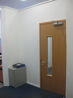 The P.A.S.T. Projects Library and Archive at Woodmill is due to be housed in the old mail room space, which is attached to the reception desk. I'm not sure how they used it as a mail room, but somebody thought that building loads of awkward corners and diagonal walls would be a good idea? Still, we can use the corner niche for some nice deep bookshelves and, if we take out a door and fill the space in, we can have one long wall of display space. We cleared out alot of the rubbish and at present it looks as follows: